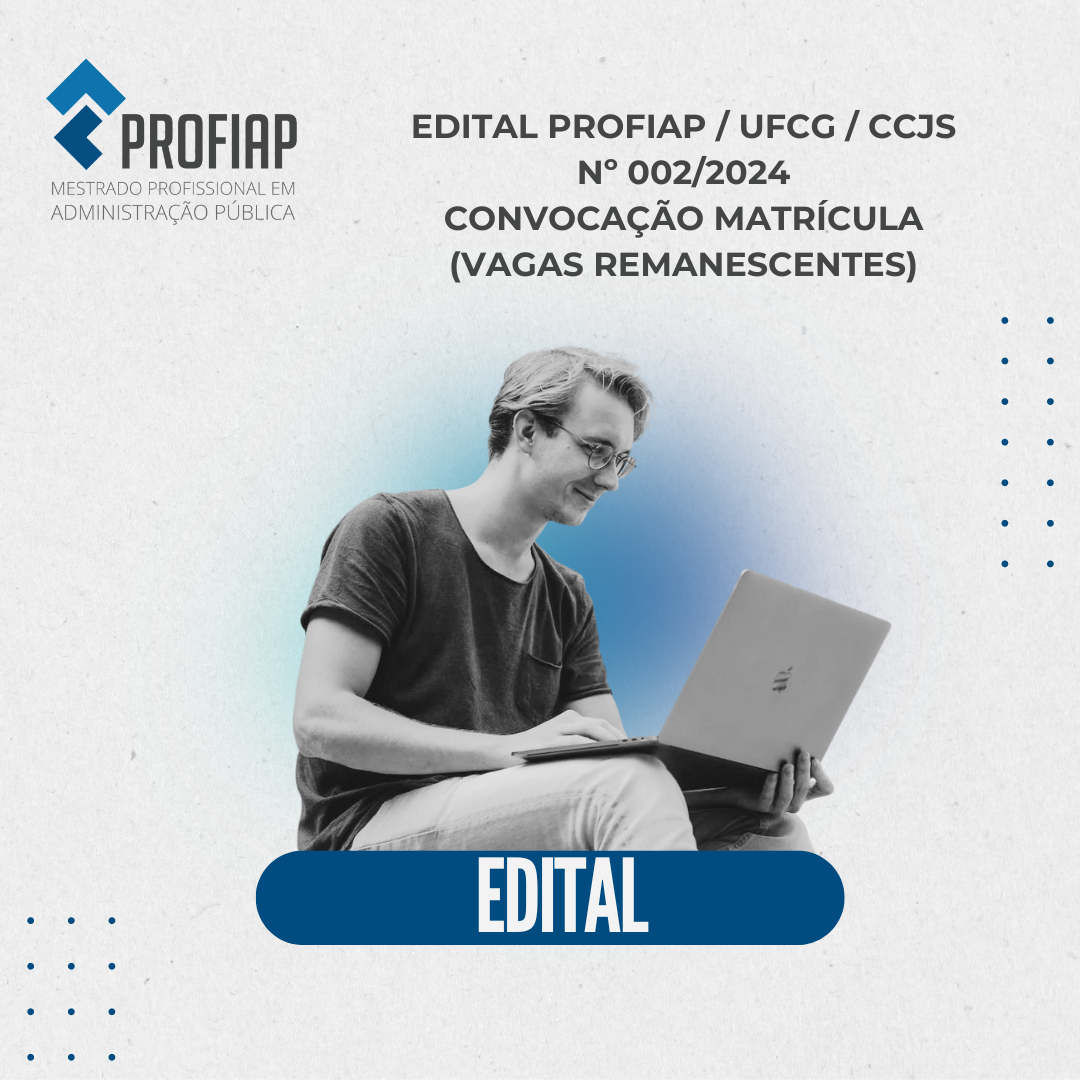 Conforme estabelecido no Regulamento Geral dos Programas de Pós-Graduação Stricto Sensu da UFCG (Resolução 03/2016 – Câmara Superior de Pós-Graduação), no Regulamento do Mestrado Profissional em Administração Pública em Rede Nacional e Edital PROFIAP no 01/2024 - ENA 2024/01, está aberta a confirmação de interesse e matrícula para 02 (duas) vagas remanescente para a Turma do 1o semestre de 2024 do PROFIAP/UFCG/CCJS, conforme: